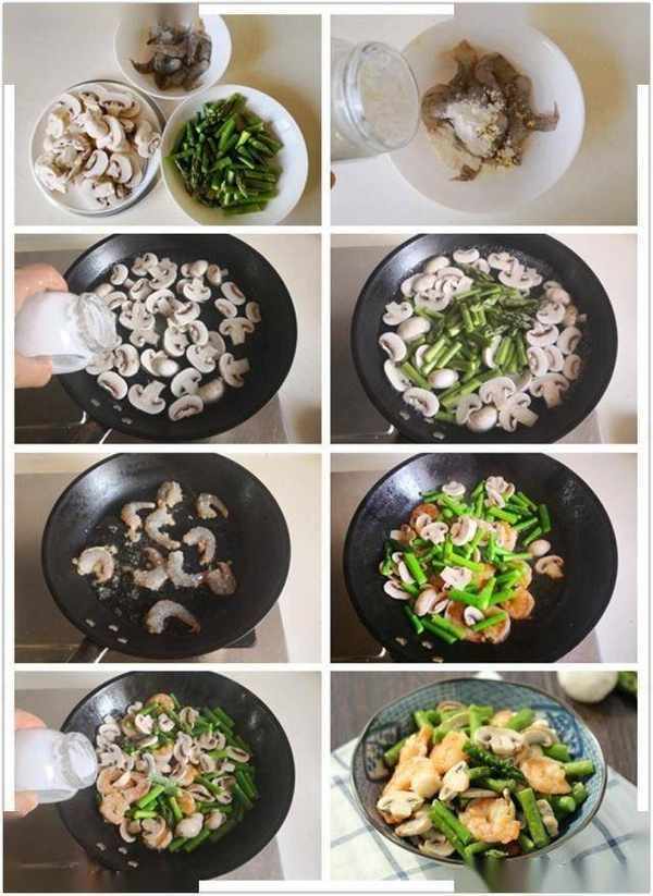 制作:鮮大蝦去殼後挑出蝦線, 將處理過的蝦仁中放入少許鹽、料酒、淀粉和薑末,拌均勻醃制一下。燒鍋水加入少許鹽和幾滴油,將口蘑入鍋焯煮一分鐘後再加入蘆筍進去焯燙變色後撈出備用。熱鍋涼油, 將蝦仁放進鍋中翻炒至變色,加入蘆筍和口蘑進去翻炒幾下,最後加入少許鹽調味翻炒均勻即可。
