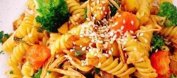 雞胸肉,意面,西紅柿,西蘭花,甜椒。蔥薑,鹽,黑胡椒,蒜香粉,辣椒粉。