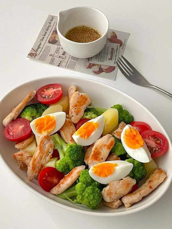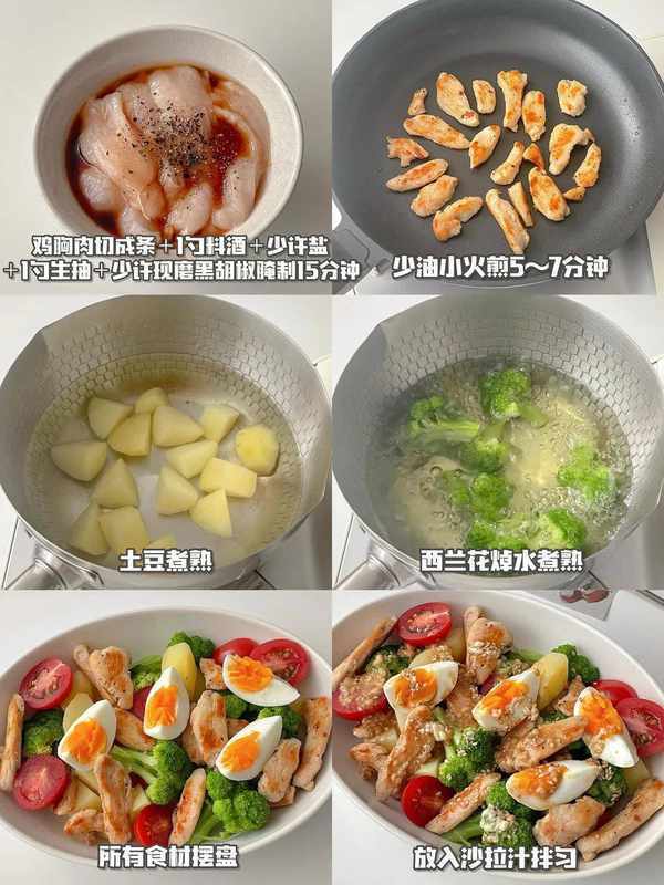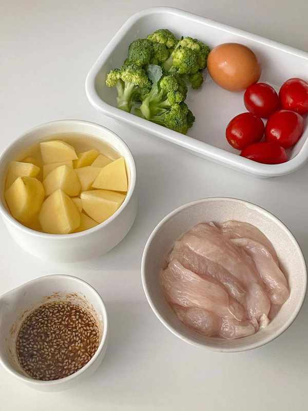 材料:西蘭花、雞蛋、雞身材肉、聖女果,土豆塊