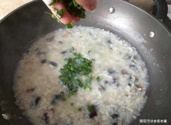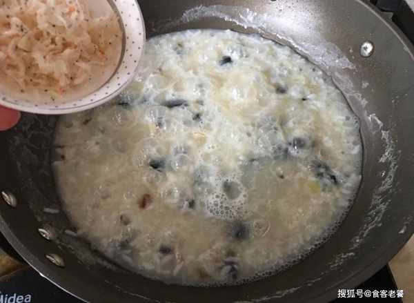 2把隔天剩下的飯倒進鐵鍋裡,下入純凈水開大火煮至沸騰。接著將一半份量的皮蛋、瘦肉和薑絲放進鍋裡,大火煮5分鐘後,再轉小火蓋上鍋蓋再煮10分鐘。