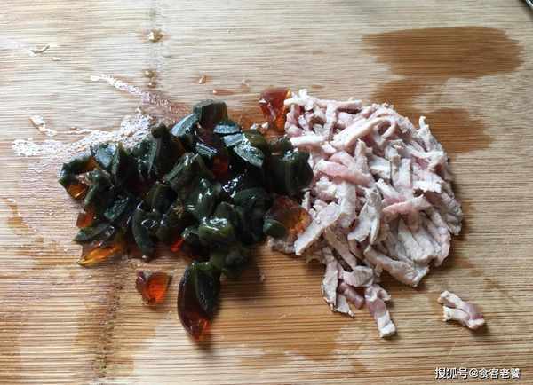 1冷水下鍋煮開,下入一塊瘦肉焯水後撈出過涼水,瀝幹水分後切成絲,再將皮蛋剝殼後切小塊,生薑切絲,放在一旁備用。
