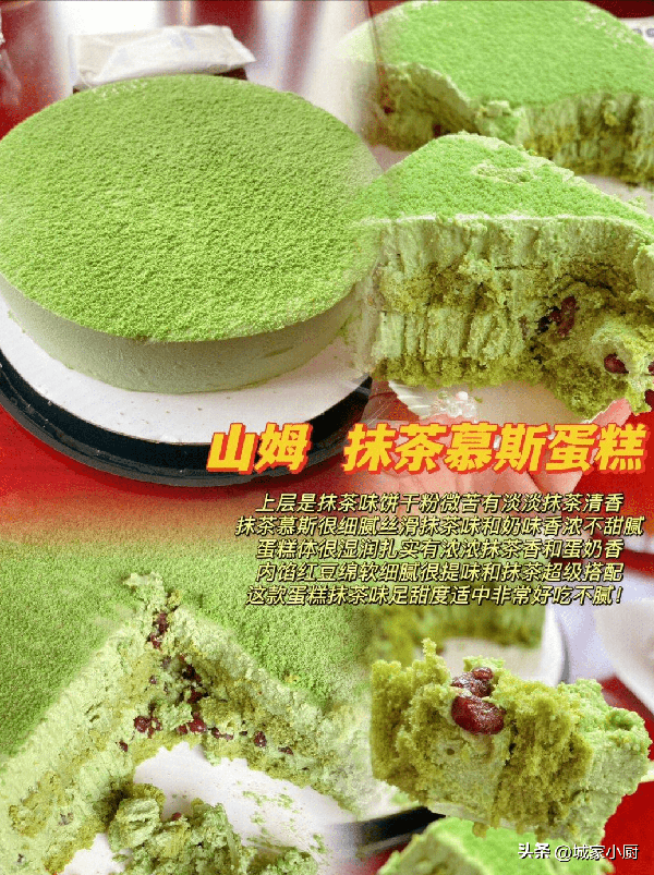 上層是抹茶味餅幹粉,抹茶慕斯很細膩,抹茶味和奶味香濃,蛋糕體很濕潤紮實,紅豆餡綿軟細膩很提味,和抹茶超級搭,這款蛋糕抹茶味足,甜度適中非常好吃不膩。