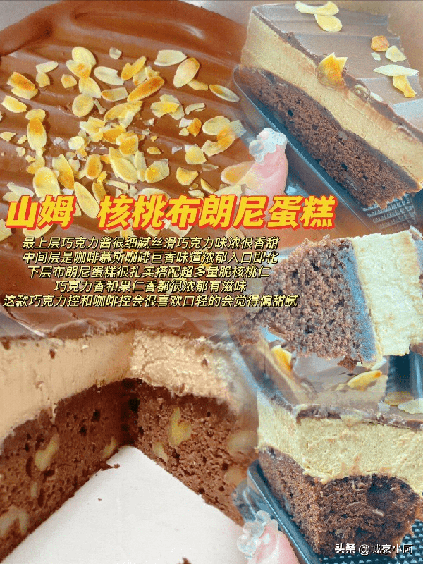 上層的巧克力醬很細膩,中間層是咖啡慕斯咖啡巨香,下層佈朗尼蛋糕很紮實,搭配超多的脆核桃仁,巧克力香和果仁香都很濃鬱,這款巧克力控和咖啡控會很喜歡,就是口輕的會覺得偏甜膩。