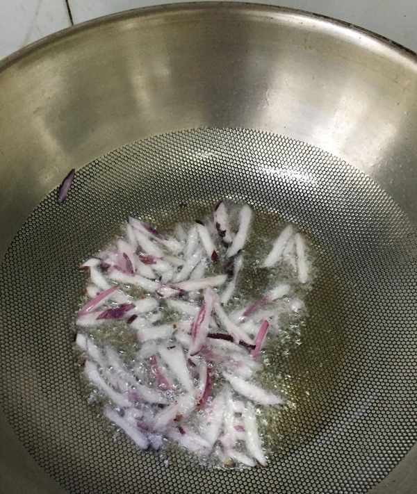 鍋燒熱放植物油,用切碎的洋蔥爆鍋。