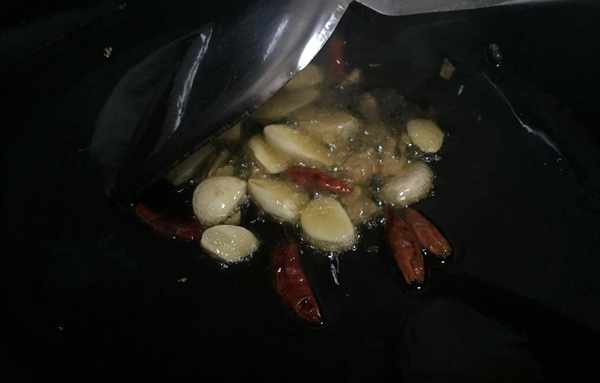 3.鍋裡下油加熱放幹紅辣椒、大蒜、生薑爆香,再倒入牛筋翻炒,加入少許生抽,然後把牛筋扒拉至一邊