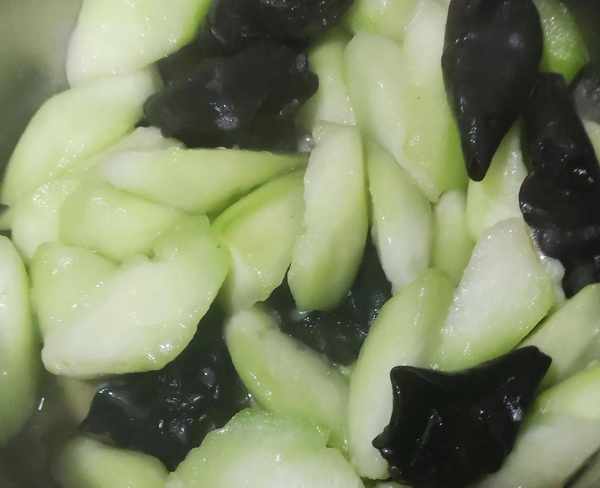 油燒熱,絲瓜倒入鍋中煸炒至變軟,加一碗水燒開,期間放入黑木耳,我還喜歡加少許的榨菜絲,提味!