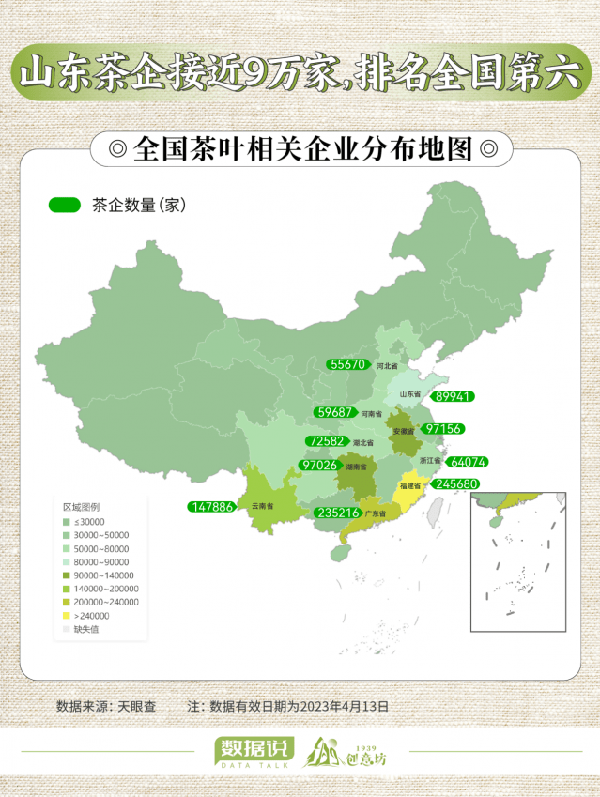 時至今日,山東茶葉市場依舊活躍。一方面,作為全國最大銷地茶葉交易中心,濟南茶葉批發市場十餘年來每年交易量以10萬擔的速度遞增,年交易量超過80萬擔,年交易額超過13億元。另一方面,山東省茶企數量位居全國前列,天眼查數據顯示,山東現有茶葉相關企業近9萬傢,是唯一一個沖進全國前6的北方省份;其中,臨沂、青島、濟南、日照、濰坊位列全省前5,茶企數量分別達13138、13113、9912、7673、7190傢。