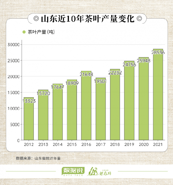 看產量,山東統計年鑒數據顯示,2021年,山東生產瞭28536噸茶葉,10年間增加瞭114%,比2018年上漲28.4%。看產值,中國農業科學院茶葉研究所數據顯示,山東每畝茶葉第一產值超過8000元,高於全國平均水平80%以上。
