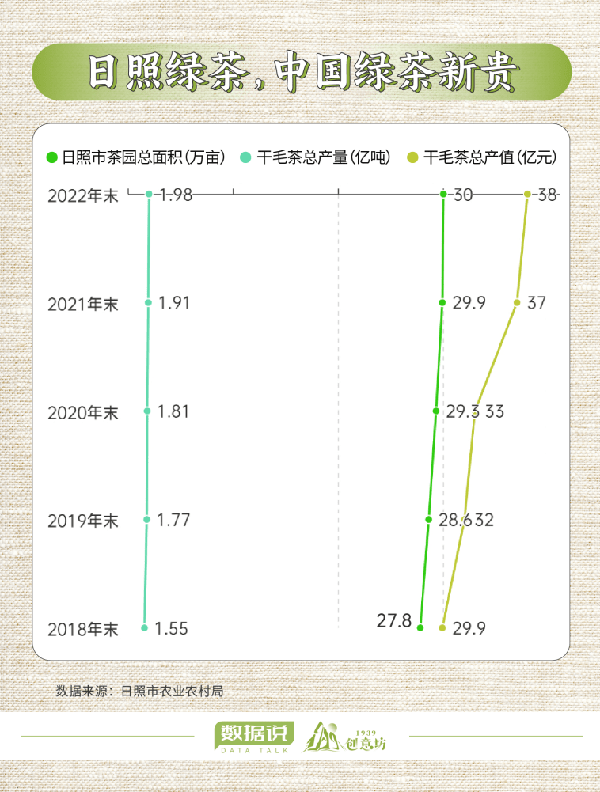作為山東省茶葉主產地,日照市坐擁30萬畝江北最大綠茶基地,是我國高緯度地區面積最大,產量及產值最高的優質茶產區。記者從日照市農業農村局瞭解到,截至2022年末,日照綠茶年產幹毛茶近2萬噸、總產值達到38億元,日照茶農種茶畝均收入是南方地區的2-3倍。