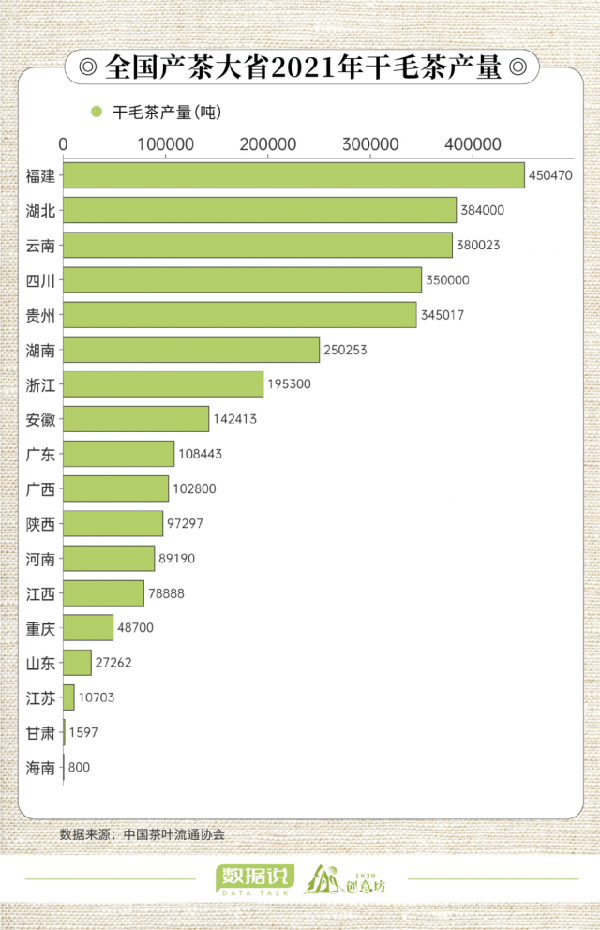 中國茶葉流通協會近3年的數據,進一步證實瞭山東茶的崛起之勢。2022年,山東幹毛茶產值排名全國第13,超越種茶歷史悠久的江西省。2021年,山東幹毛茶產值達到74.85億元,比2020年增長149.50%,遠超於全國11.84%的平均水平,增幅位列18個產茶大省之首,增長勢頭非常強勁。