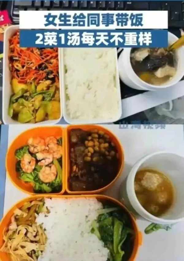 在湖北武漢,有一位勤勞的女子肖女士,每天都會給同事們帶午飯。令人驚喜的是,每天的飯菜都不相同!從3月份開始,肖女士就開始瞭這個美好的傳統,每頓飯隻收象征性的15元。每天她會準備大約8份飯菜,包括2道菜和1碗湯。
