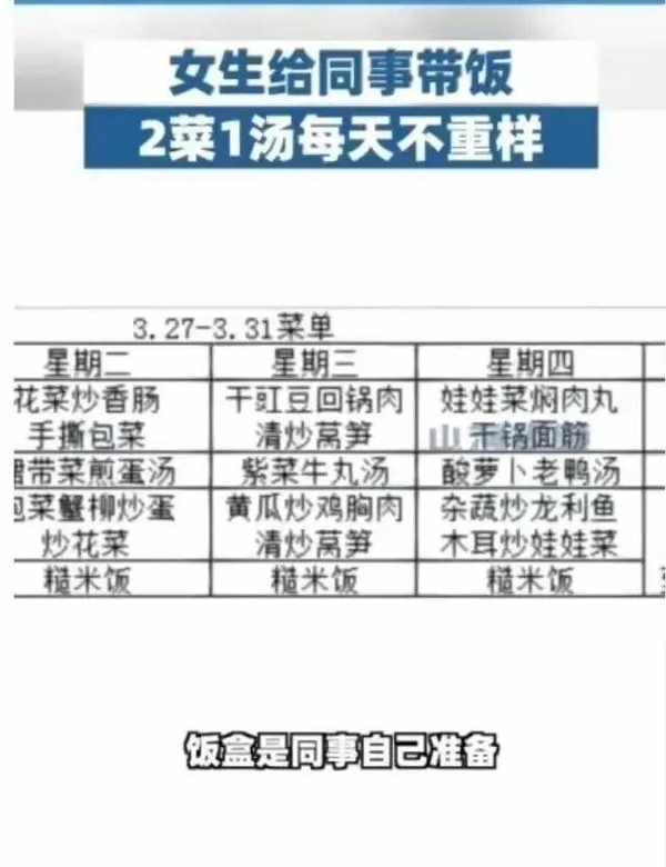 肖女士的午飯備得十分用心,每周五她會準備下周的菜單,分為常規組和漂亮組。常規組包括一些傢常菜和地方特色菜,而漂亮組則更偏向清淡和營養。每周的菜單都不同,這樣同事們不用每天糾結吃什麼,也能享受到不同的口味。