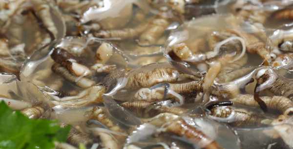 這是福建的一種特色小吃,這個小吃所用到的原料是一種蠕蟲然後經過熬煮,最後凝結成塊兒,外面猶如我們平時吃的皮凍,裡面可以清晰看到蠕蟲,據說營養價值也是特別高,但隻是看到裡面的蟲子,很多人就已經接受不瞭瞭。
