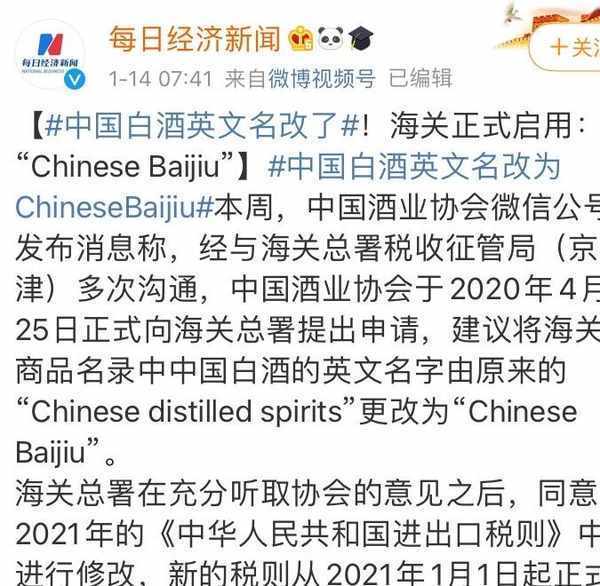 白酒明確國際名稱為Baijiu