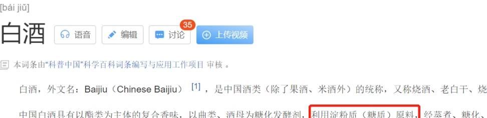 但小編在兩項酒類新國標發佈一個多月後的今天,百度瞭“白酒”,詞條仍然顯示白酒是利用淀粉質(糖質)為原料,或許是還沒來得及修改,也可見大傢對白酒的認知還停留在模糊上。