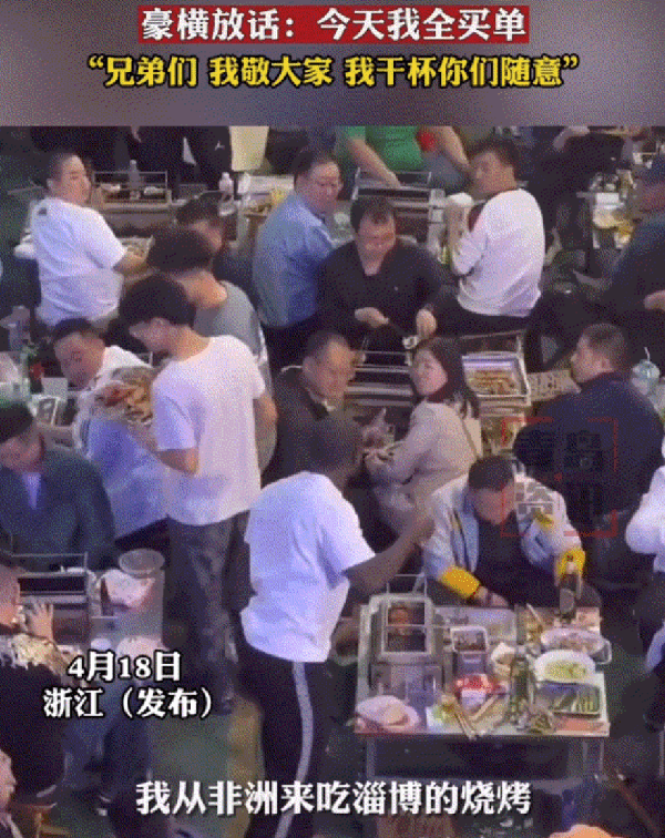 山東淄博,露天燒烤一條街,來自非洲的一位王子,美滋滋地吃著中國的特色燒烤,吃到鮮美之處,外國王子站起來大聲地對燒烤街所有的人宣佈:“我從非洲過來吃淄博燒烤,今天我全買單。”