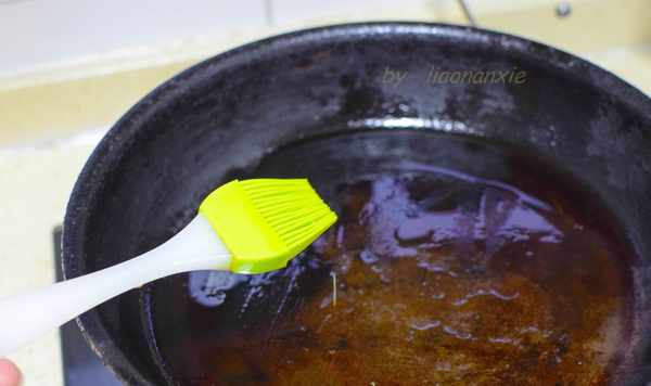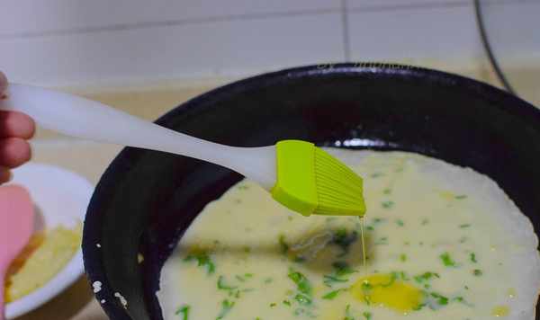 平底鍋預熱,刷一層薄油,油不能多,太多油面糊下鍋很難做成餅子。