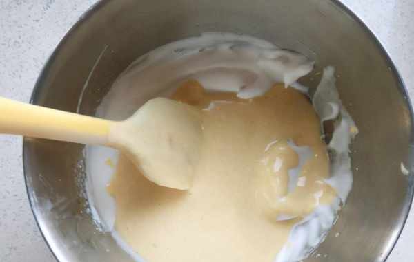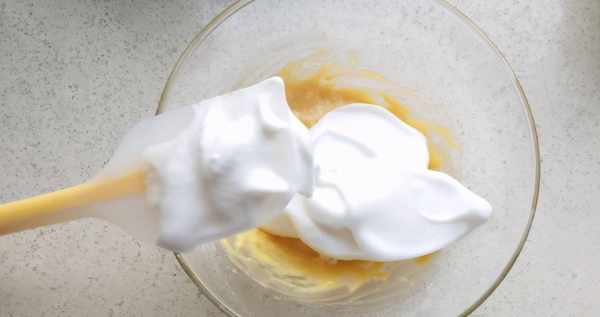 14、把翻拌好的面糊倒進剩下的蛋白裡,繼續從下往上翻拌均勻。