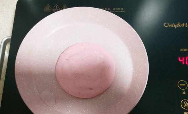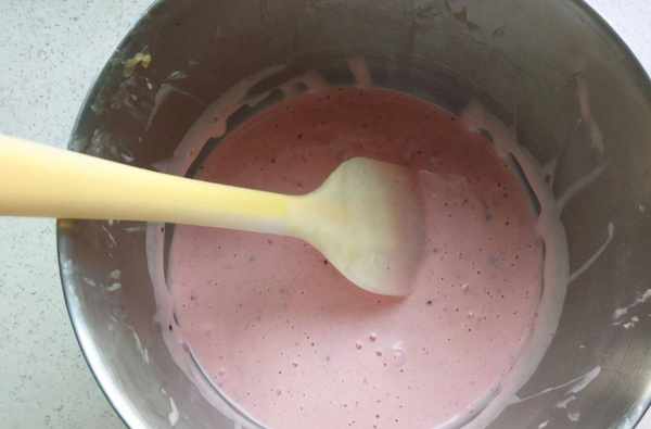 15、往混合好的蛋液裡加入火龍果泥,攪拌均勻。