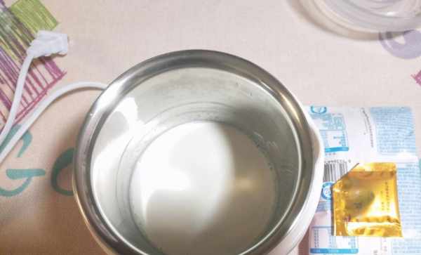 2、先往酸奶機裡倒進去一小部分牛奶。