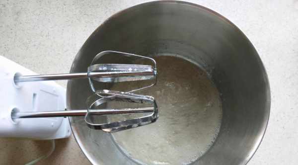 11、把蛋清放在打蛋盆裡,擠進去兩滴檸檬汁,打蛋器開到二檔,打到蛋清發白。