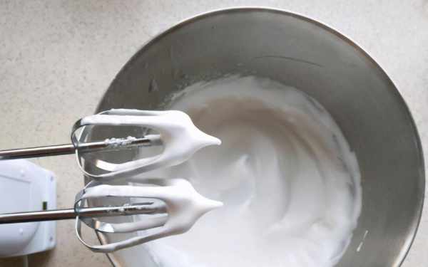 12、分三次加入糖粉,接著用二檔打發,打到打蛋器拿起來的時候,蛋清掛在打蛋器上但是不往下掉。