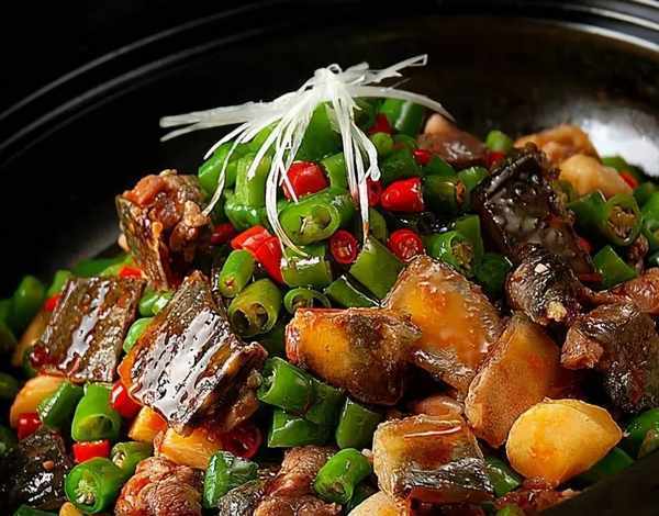 甲魚1隻(約1000克)土豆塊500克四季豆節200克泡薑絲50克泡椒節20克農傢自制豆瓣醬、鹽、白糖、味精、鮮湯、自制甲魚油各適量