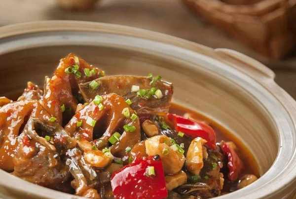 3.鍋裡放化豬油和菜油,下入蒜子、花椒炒香,然後倒入甲魚塊稍加煸炒,再加豆瓣醬一起炒。接著摻入濃湯,慢火燉至甲魚塊糯入味時,加入甜椒汁、紅甜椒塊和壓好的紅藕收汁,並加適量鹽、白糖和味精調好口味。