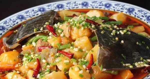 特點:成菜色澤紅亮,甲魚肉軟爛入味,裙邊肥腴,土豆入味,而不爛。