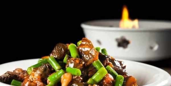 3.將壓好的甲魚塊、熟土豆塊和熟四季豆節倒入炒鍋,舀入自制湯汁和香料油燒煮,待湯汁收濃稠,起鍋盛入青花瓷盤中,撒上蔥花。