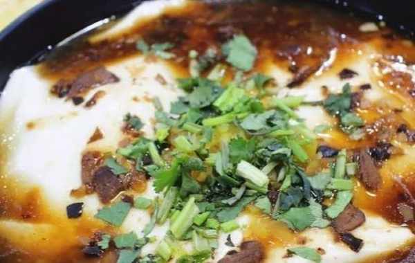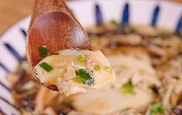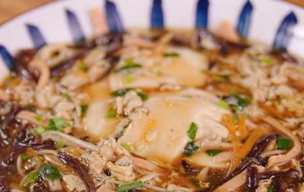 第四步:最後就可以撒上水淀粉,勾芡出濃稠的湯汁之後,澆淋在裝碗的豆腐花上面就可以直接品嘗瞭。