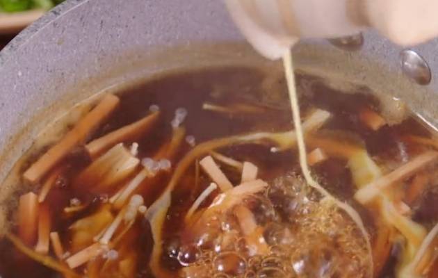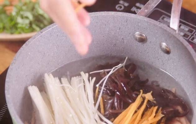第二步:另外準備一鍋250ml的沸水,把預先處理好的黑木耳絲,胡蘿卜絲,金針菇倒入鍋中,大火水煮四分鐘。