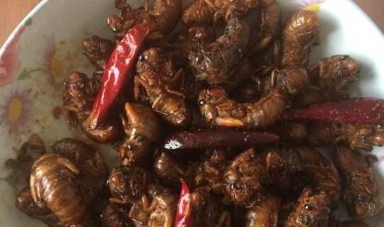 金蟬在山東叫法不同,聊城叫“結瞭龜”,臨沂則叫“知瞭龜”。夏夜鄉村的樹林中沒有什麼光,很多人帶上一個手電筒和一個廣口瓶,運氣好的話,捉上幾十個沒有問題。回傢後當晚將這些活著的小“多肉”撒上鹽,第二天中午就可以用油炸瞭。炸好後顏色金黃,又酥又香,吃到嘴裡那種美味簡直無法言表。但很多南方人是不喜歡吃金蟬的,覺得這是一種在地下爬出的蟲子,有點臟和恐怖,正如我們北方人無法理解南方人敢於吃蛇一樣。