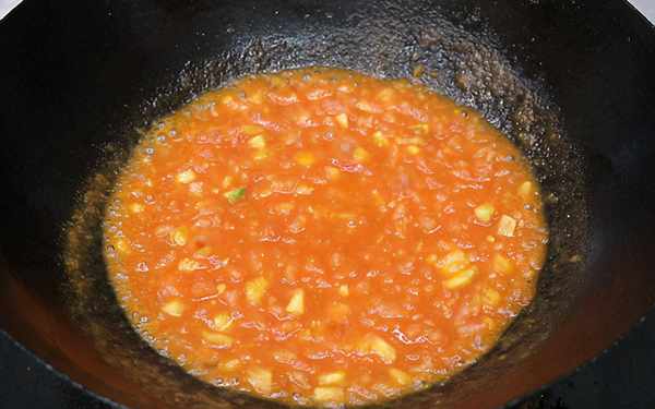第三步:將鍋燒熱,加入少許食用油。加入西紅柿丁,翻炒以去除裡面的汁液。在翻炒過程中,用勺子按壓並煮沸,直到所有的湯都出來。
