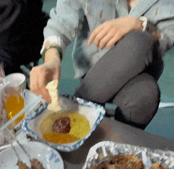 看席地而坐的人們裹著油汪汪的肉串、卷著被命名為碳水炸彈的小餅狂炫。
