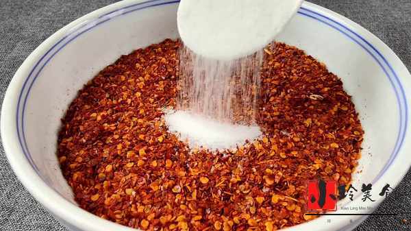 加入1勺鹽、1勺胡椒粉和50毫升熟菜籽油。這一步是為瞭防止辣椒面翻炒,攪拌均勻,備用