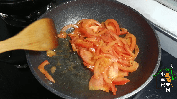 第三步:煎炸的那一刻,不要用太多的火。用鏟子把沒有炒過的西紅柿搗碎,使它們更強壯