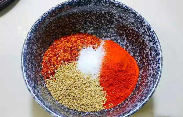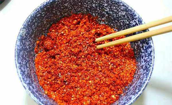 2.首先,將一勺粗辣椒面和一勺細辣椒面放在碗中,然後加入少許冷油,攪拌均勻成塊狀。這樣可以防止它們以後因為油溫過高而油炸。每個人都必須記住這一點。