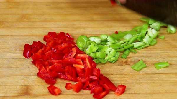 趁著這個時間,我們把準備好的青辣椒和紅辣椒切一下。青辣椒和紅辣椒主要用於顏色搭配,喜歡吃辣的食物,也可以增加辣味。因此,我們可以將它們切碎或切成小塊。清理幹凈後,把它們放在盤子裡待用。