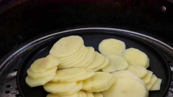 2.首先,我們來處理土豆。將我們準備好的土豆洗凈、去皮、切片,放入冷水蒸鍋中蒸至熟。土豆需要蒸很長時間,大約20分鐘。