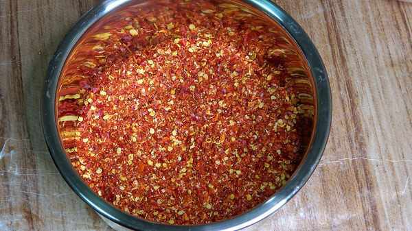 首先,準備200克辣椒面,由河南新一代辣椒和四川二荊條辣椒混合而成。上圖中的短辣椒是新一代河南辣椒,而長辣椒是四川二荊條辣椒。河南新一代辣椒的特點是微辣,色澤鮮紅色,非常香。四川二荊條辣椒的特點是色澤鮮艷,與河南新一代辣椒的香氣不同。它幾乎沒有辛辣的味道。如果你喜歡辣的食物,你也可以加一些貴州子彈頭辣椒。