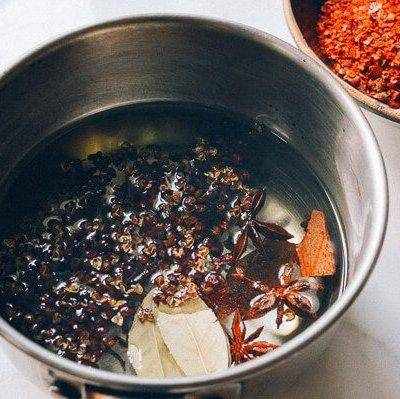 2.在小煎鍋中用中火加熱油、八角、桂皮、月桂葉和花椒。當油開始輕微起泡時,將其轉為小火。將油溫控制在100-120攝氏度之間,以避免燒焦香料。保持此溫度並加熱機油30分鐘。如果油中的小氣泡消失,將火調至中等,看到氣泡後再調至低火。油加熱後,各種香料的顏色會稍微變深,但不會完全變黑。發黑表示燒焦,燒焦的香料會嚴重影響辣椒油的口感。機油溫度保持在100-120攝氏度。