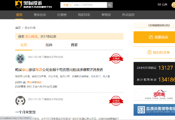 此外,黑貓投訴上亦顯示,有消費者投訴泰山啤酒缺斤少兩、商品污染嚴重、不發貨、沒有售後等種類繁多的問題。