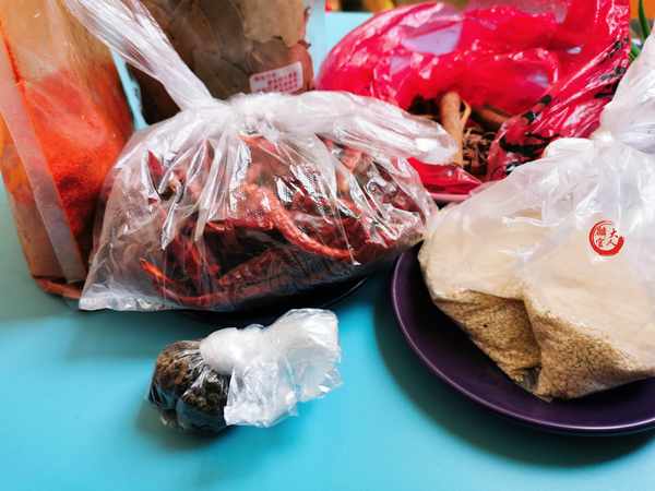 材料:洋蔥半個、蔥3小段、八角2個、桂皮1片、香葉3片、青椒少許