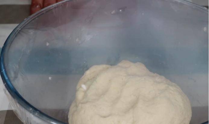 4.將白糖混合並融化後,讓我們將其放在一邊,讓其稍微冷卻。冷卻到合適的溫度後,加入三克酵母粉,繼續攪拌均勻。然後,多次少量加入300克面粉,形成絮狀物。攪拌後,我們可以開始瞭。接下來,把它揉成面團,用保鮮膜包起來,靜置半小時。