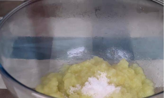 3.土豆條蒸好後,我們把它們拿出來,用搟面杖搗碎,倒入一個大碗中,然後趁熱加入10克白糖,攪拌均勻。在加入白糖的那一刻,我們一定要趁熱加入,這樣白糖更容易融化。