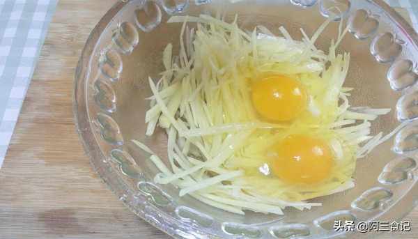 接下來,在土豆中加入適量的水蓋上蓋子,將土豆絲來回翻轉,徹底清洗幹凈。清洗幹凈後,倒掉水,然後倒入兩個雞蛋。之後,洗一些蔥花,把腐爛的部分挑出來扔掉。控制好水分後,把剩下的部分切成蔥花,然後把蔥花放在碗裡備用。