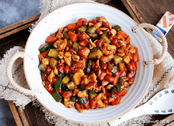 接著放入薑片、胡蘿卜翻炒,炒熟後倒入黃瓜、雞丁翻炒一分鐘。