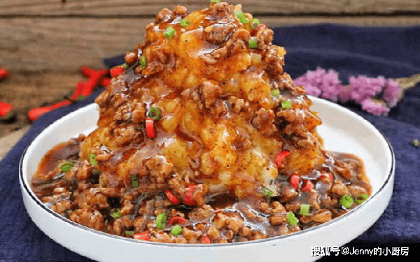 最後加入淀粉水勾芡,將肉末澆在土豆泥上,撒上蔥花、小米椒碎點綴。