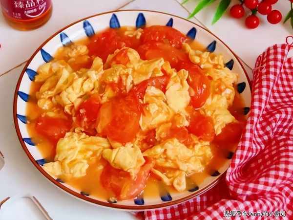 鍋內加油,燒熱後倒入蛋液,炒成小塊。接著倒入番茄翻炒片刻,炒出汁水。